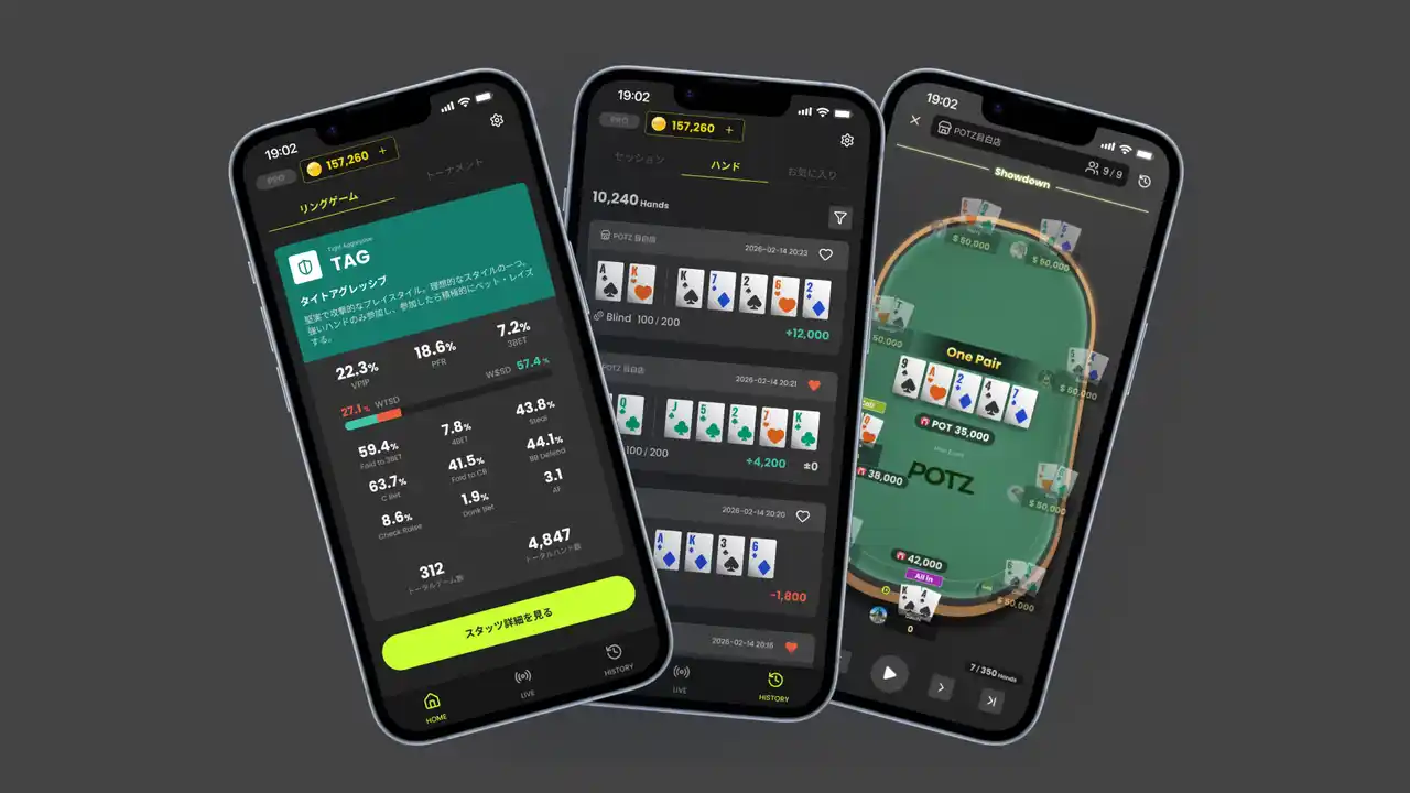 | 2026年4月28日、株式会社POTZ(本社:東京都新宿区、代表取締役:渡辺悠人)とAlanse株式会社(本社:北海道札幌市、代表取締役:岡崎大地)は、ライブポーカーのハンドやアクション履歴をデータとして記録・蓄積し、スマートフォンから確認・分析、プレイの振り返りに活用ができるプレイヤー向けモバイルアプリ「POTZ POKER」を公開します。 | |||||||||||||