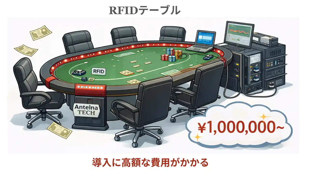 一部ではRFID技術を用いてハンド履歴を取得するシステムも存在していますが、 専用テーブルや大規模な設備が必要で、導入コストが高く、普及には至っていませんでした。 |