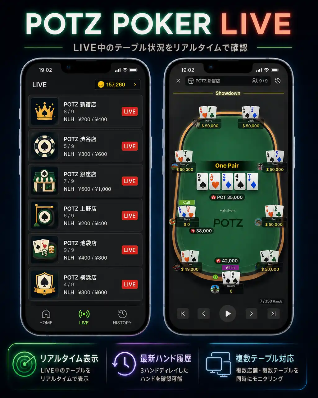 稼働中のテーブル状況を、アプリ上でリアルタイムに確認できます。 複数店舗・複数テーブルの進行状況を一覧で把握でき、3ハンドディレイされた最新ハンド履歴も確認可能です。 配信中のゲームや注目テーブルを、いつでもアプリからチェックできます。 |