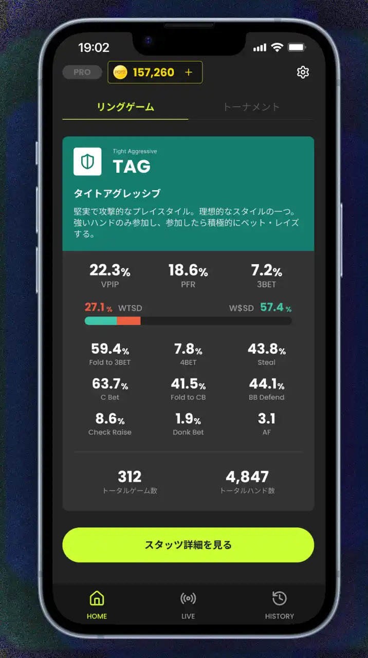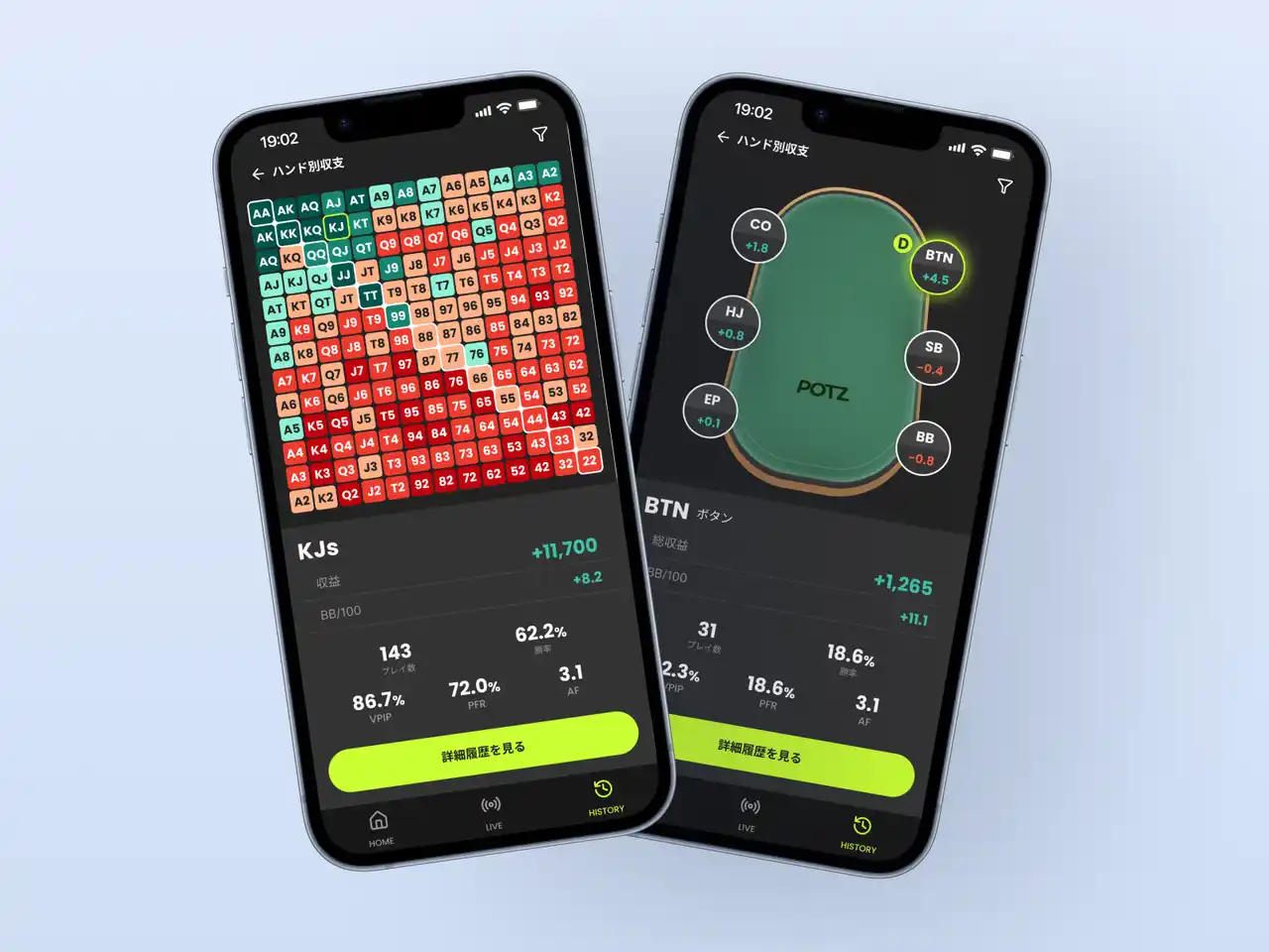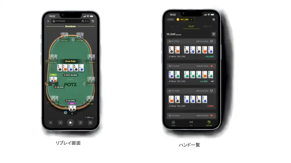 | POTZでは、第1弾リリースとして、ライブポーカーのハンド履歴を記録し、スタッツとして確認できる環境を提供します。 | |||||||||||||