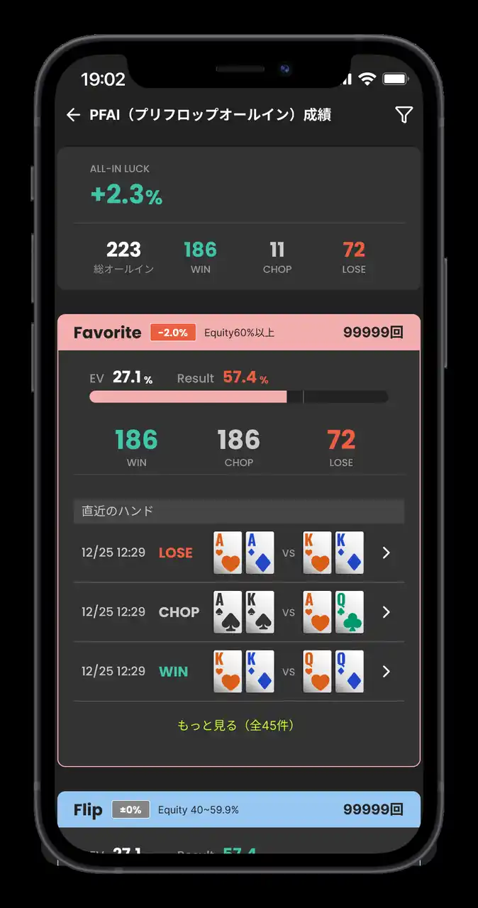 POTZでは、オールイン時の本来の勝率と実際の結果を比較することで、 自分がどれだけ “運がいいのか” “下振れしているのか” を確認できます。 |