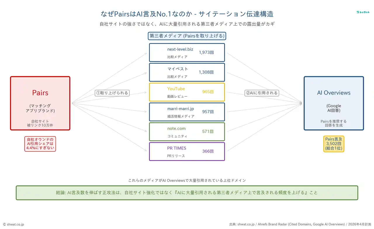 総合ランキングではPairsがAI言及3,502回で圧倒的1位、2位withの1.4倍