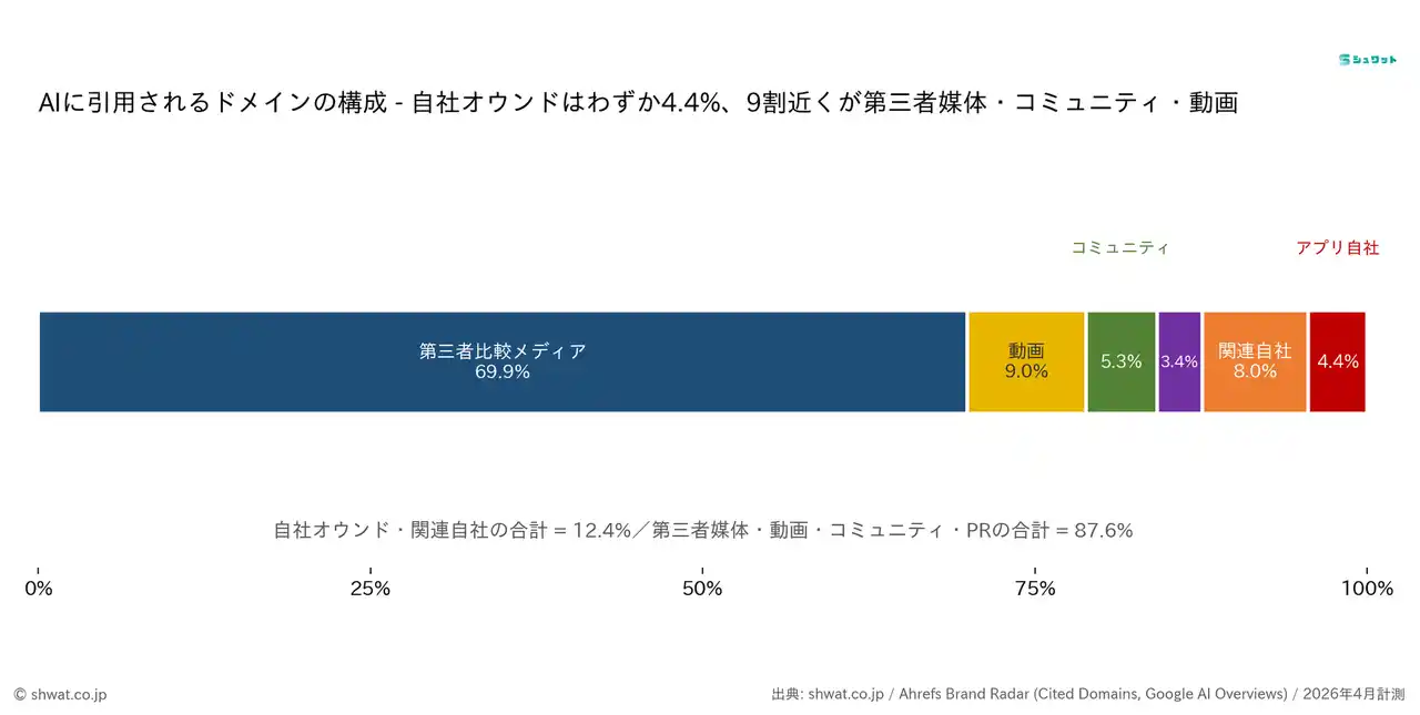 自社オウンドの構成比はわずか4.4%で、第三者比較メディア(69.9%)・動画(9.0%)・コミュニティ(5.3%)・PR(3.4%)の合計が87.6%を占める結果となりました。 |