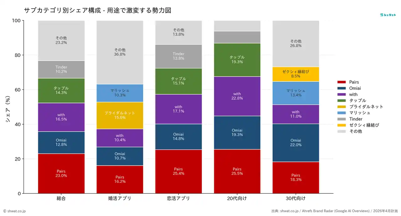 各サブカテゴリでのシェア構成を見ると、Pairsは総合23.0%・恋活25.4%・20代25.5%とほぼ4分の1を占める一方、30代では18.3%まで低下します。 |