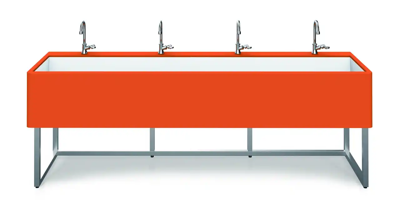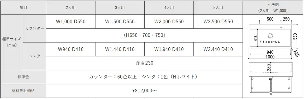 このたび加わった「フラップLL」は、小学生から大人まで使える大型タイプ。従来2タイプのみのシンクサイズが、「フラップLL」では1mm単位でシンク間口の指定が可能となり、自由度が増しました。カウンターの幅も同様にサイズ指定できるため、設置場所に隙間なくぴったりフィットします。標準サイズはコンパクトなW1,000mmの2人用から、大きなW2,500mmの5人用まで、幅広くラインアップしています。標準サイズの4タイプについては、特注対応によりシンク四隅をR形状に加工することも可能で、さらに清掃性を高めることができます。シンクはオリジナルカラーの「Nホワイト」のみ対応、カウンターは60色以上から選定でき、空間に合わせたカラー選びをお楽しみいただけます。 |