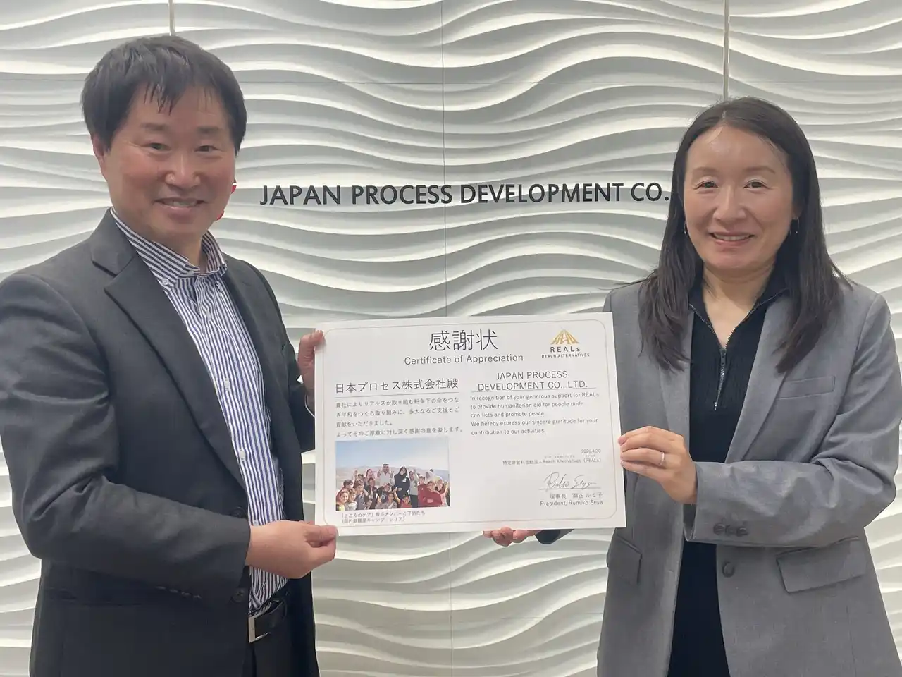 ガザ、シリアをはじめとする世界の紛争地において争い予防と平和構築に取り組む認定特定非営利活動法人Reach Alternatives(以下「リアルズ」、理事長:瀬谷ルミ子、所在地:東京都新宿区)は、日本プロセス株式会社(代表取締役社長:東 智、所在地:東京都品川区)より2025年度にいただいた500万円のご寄付に対し、活動の成果を報告するとともに、平和をつくる取り組みへのご貢献に感謝状を贈呈しました。 |