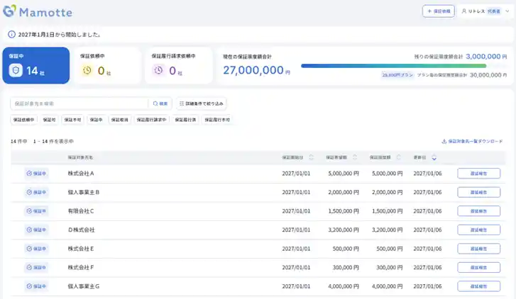 | リコーリース株式会社(以下、当社)は、2026年4月27日に債権保証サービス「Mamotte」において、契約申込から審査依頼~結果確認までをWeb上で完結できる専用サイトをリリースしましたので、お知らせいたします。 | |||