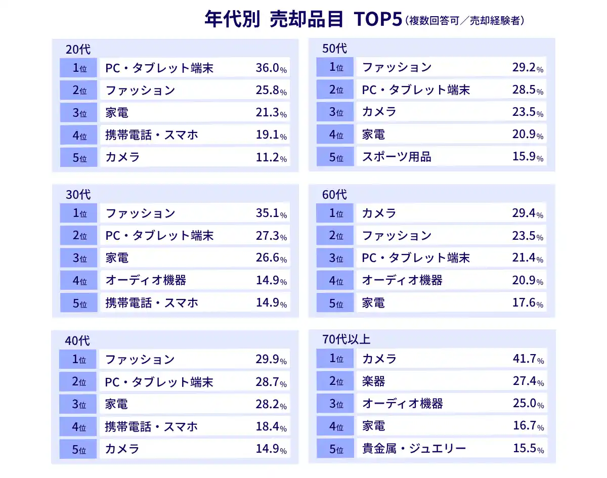 売却品目は、20~30代はファッション中心、60~70代はカメラ・オーディオ中心となり、年代によって売れるカテゴリが明確に異なっています。 |