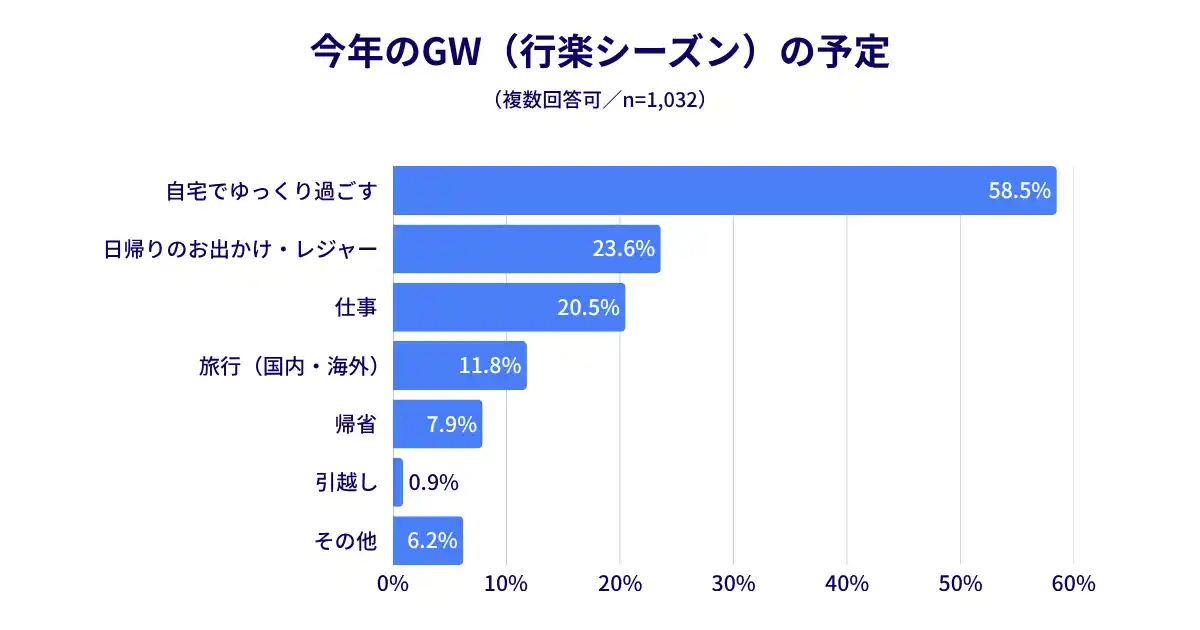 今年のGW(ゴールデンウィーク)の予定を聞くと、約6割が「自宅でゆっくり過ごす(58.5%)」と回答しました。「旅行(11.8%)」の約5倍で、在宅時間が長い"巣ごもりGW"だからこそ、普段できない大物の整理や、宅配買取・フリマアプリを使った"在宅リユース"が起きやすい環境が整っています。 |