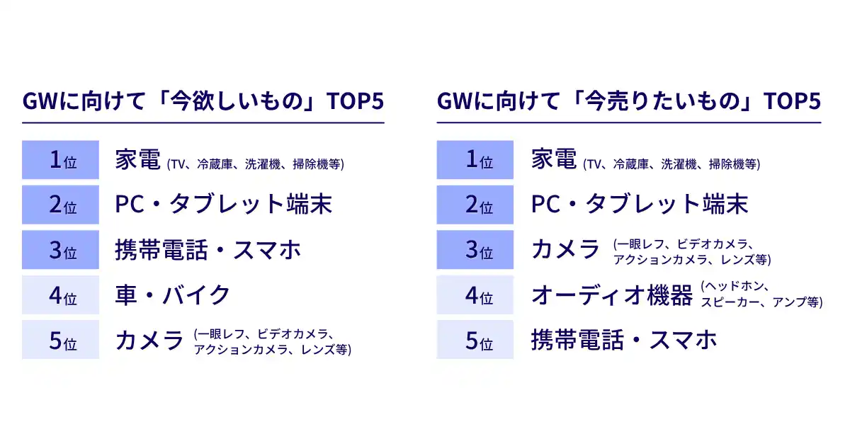 GW時期は「在宅時間増加 × 片付け・買い替えニーズ × 旅費調達」が重なる、リユース需要が高まるタイミングの一つです。取引が活発であるほど、売却では高額取引の可能性が高まり、購入でもたくさんのリユース商品が市場に出るので、欲しい物がみつかりやすい時期と言えます。 |