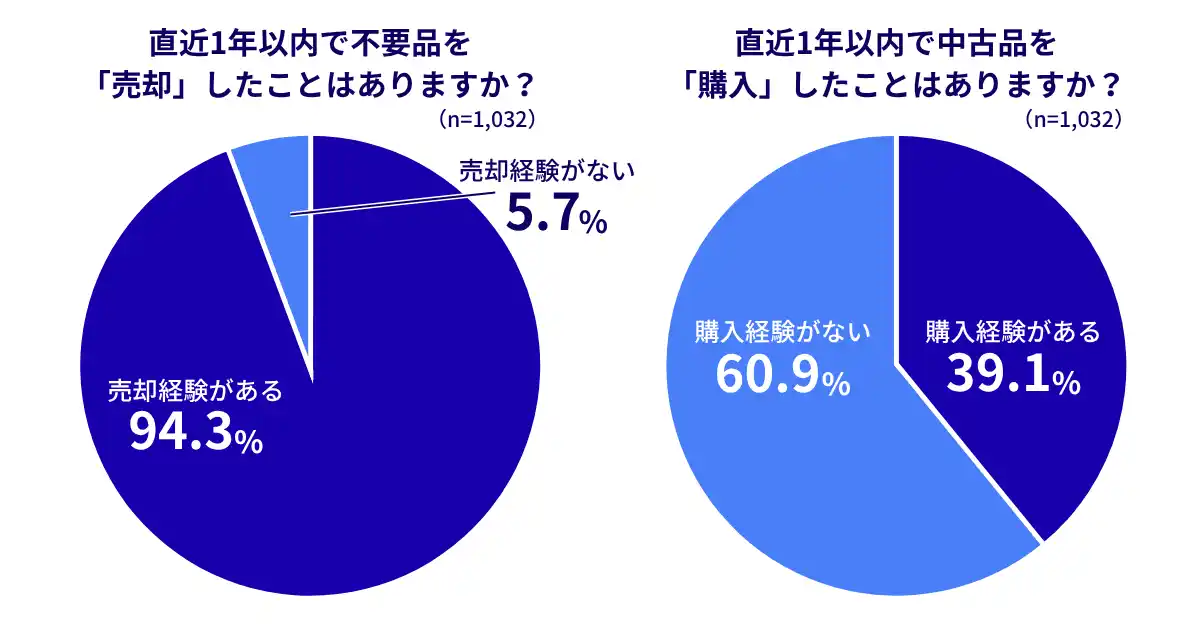 直近1年のリユース売却経験・購入経験を聞いたところ、売却経験が94.3%に対して、購入経験は39.1%と開きがあることがわかりました。 |