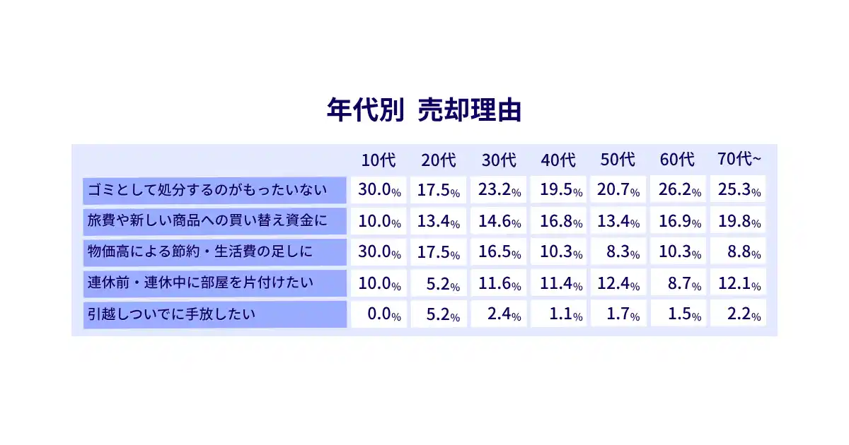 また、売却の理由を世代別で見ると、若い世代ほど「物価高による生活費の足しにしたい」という回答が多く、生活維持のためにリユースが必要な切実な背景があります。 |