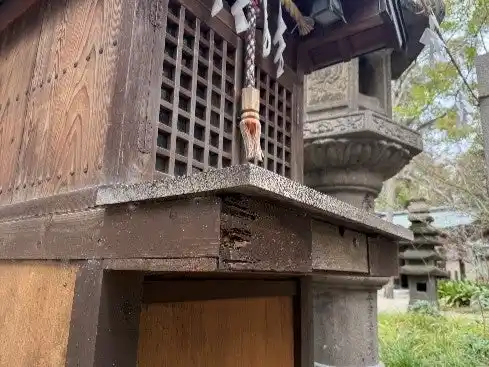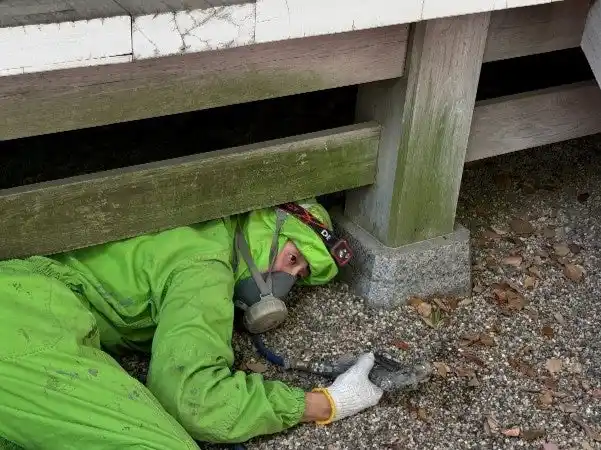 | 本殿、拝殿、瑞鳳殿のシロアリ防除施工のほか、シロアリ探知犬によるシロアリ生息調査を行ないました。本殿、拝殿は今回の調査の結果、生息は確認されませんでしたので予防施工を行ないました。瑞鳳殿は旧被害に加えて、進行中のシロアリ被害が確認されたため、駆除施工を行ないました。床高は約20cmと人が入るには非常に低いですが、シロアリ防除のプロフェッショナルであるアサンテのシロアリバスターズがしっかりと対応しました。ほかにも、特定外来生物に指定されるクビアカツヤカミキリから桜の木を守るため、薬剤処理を行ないました。 | ||||||||||