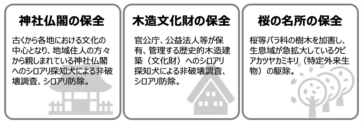 | アサンテが50年にわたり培ってきた技術とノウハウを活かして日本各地の歴史的木造建築や桜の木を守り、日本の木の文化を未来に継承することを目的としたプロジェクトです。同時に、シロアリ被害のリスクと対策の重要性を広く啓発し、巨大地震発生時の家屋倒壊抑制による減災や、家屋の長寿命化による森林資源伐採の抑制や廃棄物削減で地球環境保護に貢献することを目的としています。 | ||||||||||