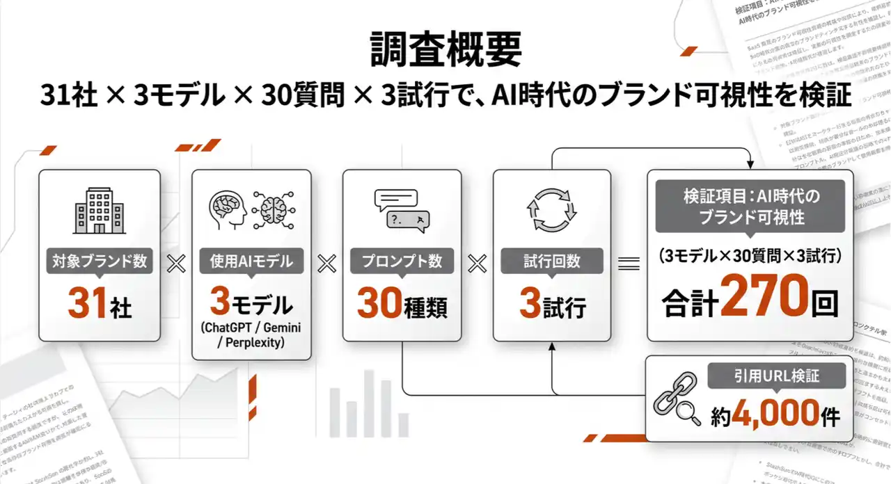 31社・3モデル・30質問・270試行・約4,000件の引用URL検証による調査設計 |