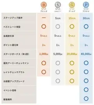 また、すべての会員ステージにおいて優先チェックイン、チェックアウト延長が、シルバーステージ以上では部屋アップグレード(空き室状況次第、保証なし)が可能になるといった特典もあり、特にリピーターのお客様から支持されています。 |