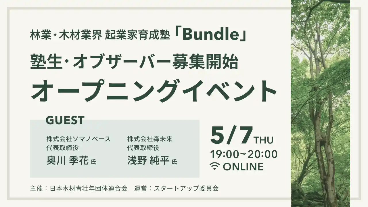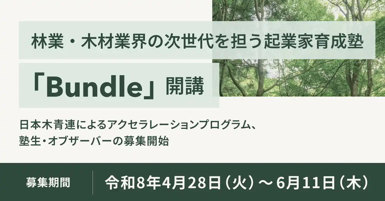 日本木材青壮年団体連合会(会長:田口房国、スタートアップ委員会 委員長:浅野純平、以下「日本木青連」)は、林業・木材業界の次世代育成と、地域を超えた連携創出を目的とした起業家育成塾『Bundle』を実施いたします。 |