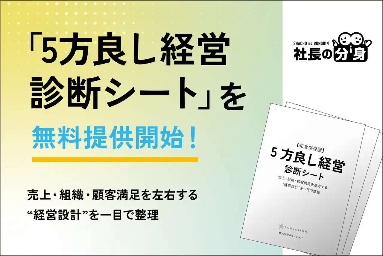 1.「社長の分身」無料登録(30秒) 2.経営個別相談(無料) 3.5方良し経営診断シートをダウンロード |