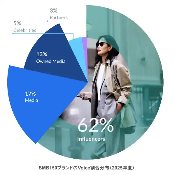 本レポートでは、ファッション、ライフスタイル、ビューティ分野における 世界150の中小ブランド(SMB) を対象に、2025年度の露出データ を基に分析を実施しました。 その結果、対象ブランド全体で 92億ドルの Media Impact Value(R)(MIV(R)) を創出しており、その約3分の2をインフルエンサーが牽引 していることが明らかになりました。このデータは、多くのブランドがインパクト創出において 特定のVoiceに依存している実態を浮き彫りにしています。 |