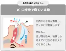 さらに、口を開けて寝ることで舌の付け根が落ち込み、のどの粘膜と震え合うことがいびきの発生につながります。こうした睡眠時の「口・のどの乾燥」や「いびき」によって、睡眠の質が低下すると言われています。 |