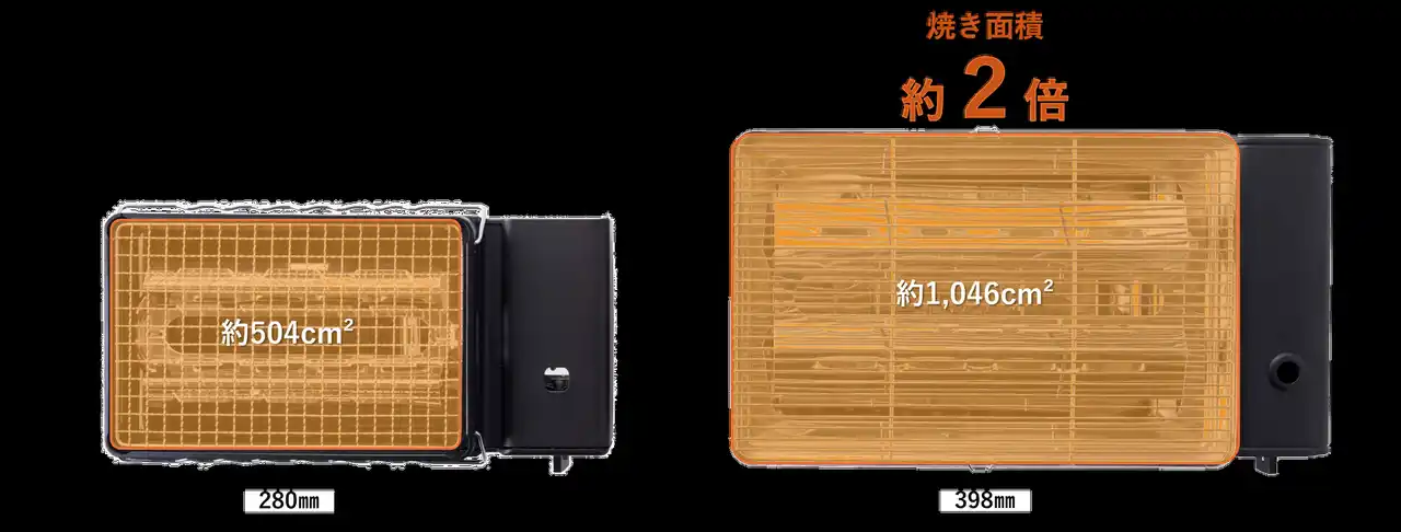 従来品「カセットガス炉ばた焼器“炙りやII”」と比較して、焼き面積は約2倍。大きな海鮮や野菜、串焼きなどをゆったりと並べられます。ご家族での食事や大人数でのパーティーでもお楽しみいただけます。 |