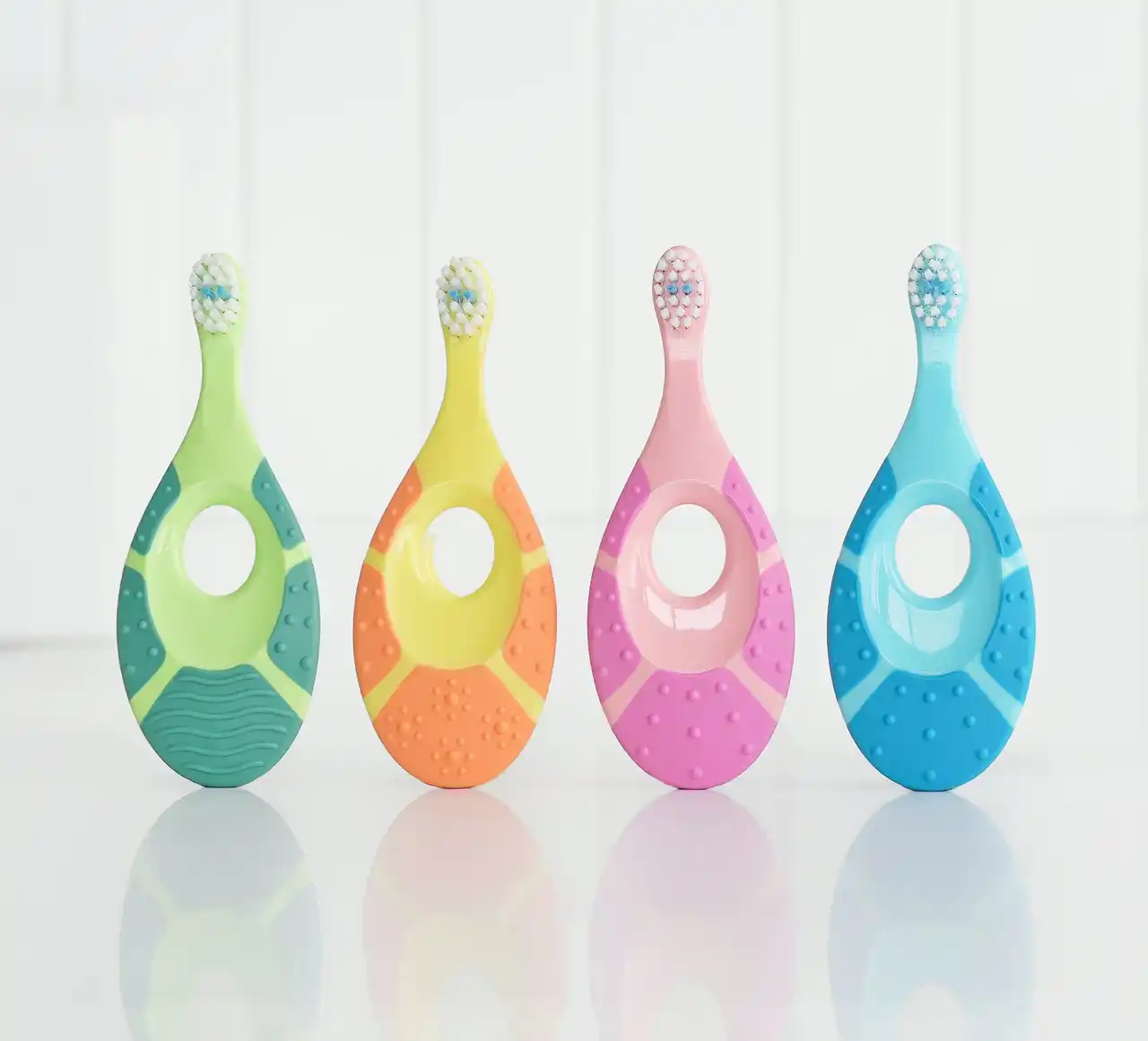 | 1.歯がためとブラシを一体化した設計で、歯磨きへの移行を助けます。 | |||||