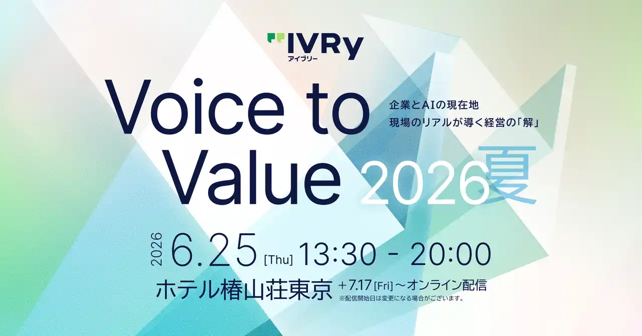 対話型音声AI SaaS「アイブリー」を提供する株式会社IVRy(本社:東京都港区、代表取締役/CEO:奥西 亮賀、以下「当社」)は、「AI実装の現在地・リアル」をテーマとしたカンファレンス「Voice to Value 2026 夏 ー企業とAIの現在地 現場のリアルが導く経営の「解」ー」を2026年6月25日(木) にホテル椿山荘東京にて開催することをお知らせします。 |