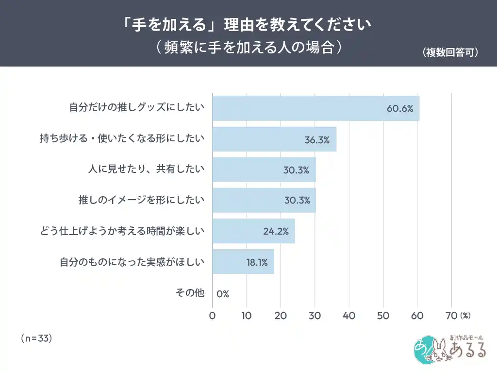推しグッズに手を加える理由の中心には、まず「自分だけの推しグッズにしたい」という自己化のニーズがあることがうかがえます。そのうえで、「人に見せたい・共有したい」という意識は、より頻繁に手を加える層に見られる特徴のひとつと考えられます。 |