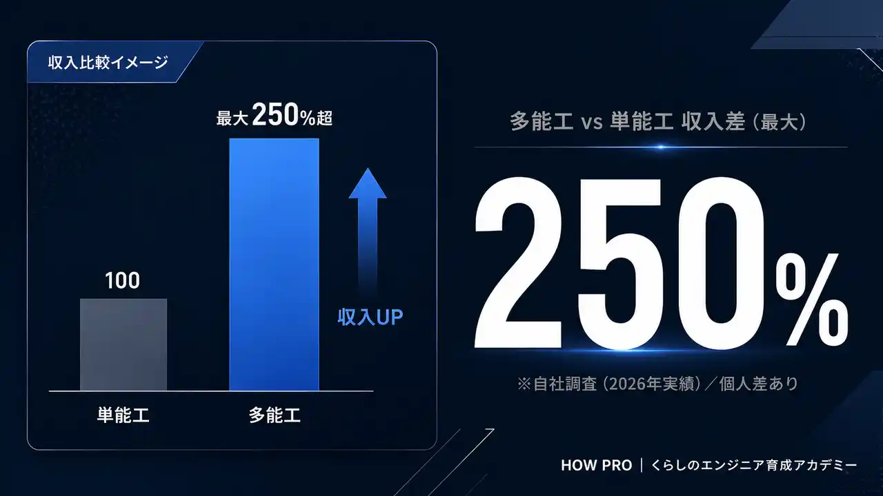 HOW PROの実績データが示す数字は明確だ。多能工化を実現したエンジニアと、単能工にとどまるエンジニアとでは、収入に最大250%超の差が生まれている。※1 |