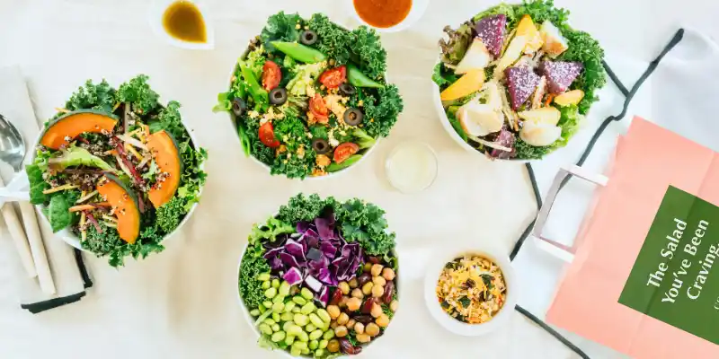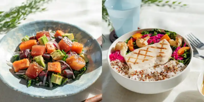 ワンボウルで野菜をふんだんに味わえるボリューム満点な 4 種のメインサラダから、お好みの 1 つをセレクト。そして、自社農園の野菜とさっぱりとした梅じゃこの混ぜごはんを組み合わせた、バランスの良いセットメニューです。その日の気分やコンディションに合わせて、自分だけの“身体が喜ぶワンボウル”をお昼時だけのお得なランチプライスでご用意しております。 |