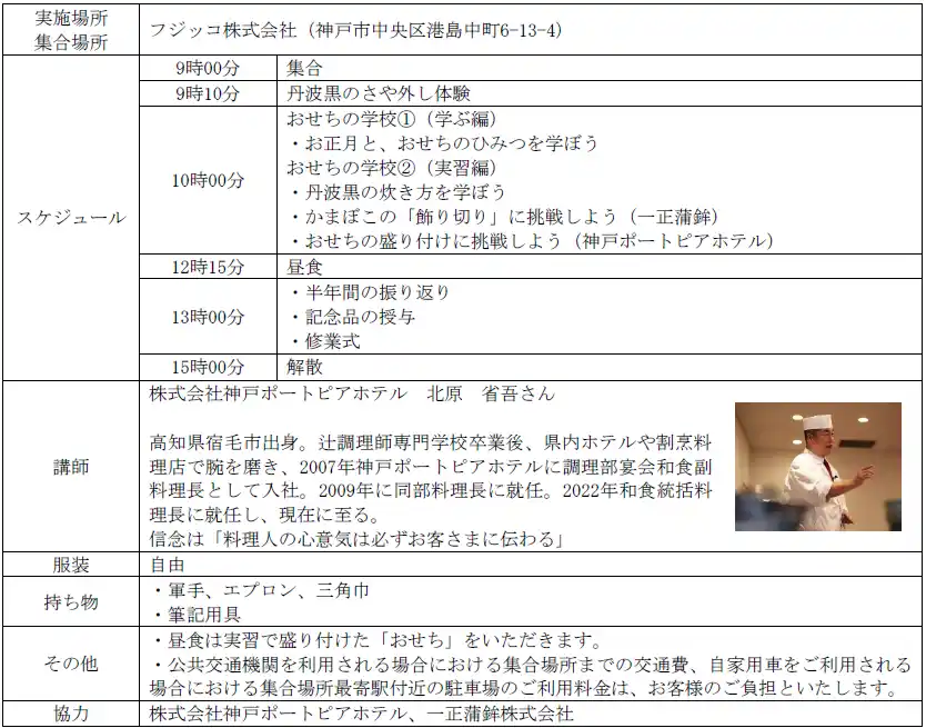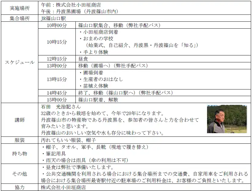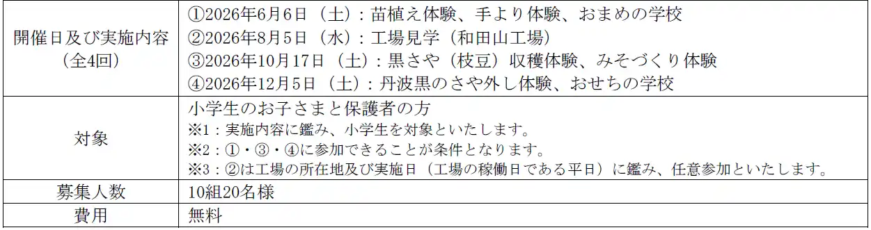 フジッコ株式会社(本社:神戸市中央区/代表取締役社長執行役員:福井正一)は、丹波黒の苗植えから収穫までの農業体験と、日本の文化やおせち料理を学ぶ会をセットにした全4回の「丹波黒育成体験プログラム」を、株式会社小田垣商店、株式会社神戸ポートピアホテル、一正蒲鉾株式会社のご協力を得て開催いたします。 |