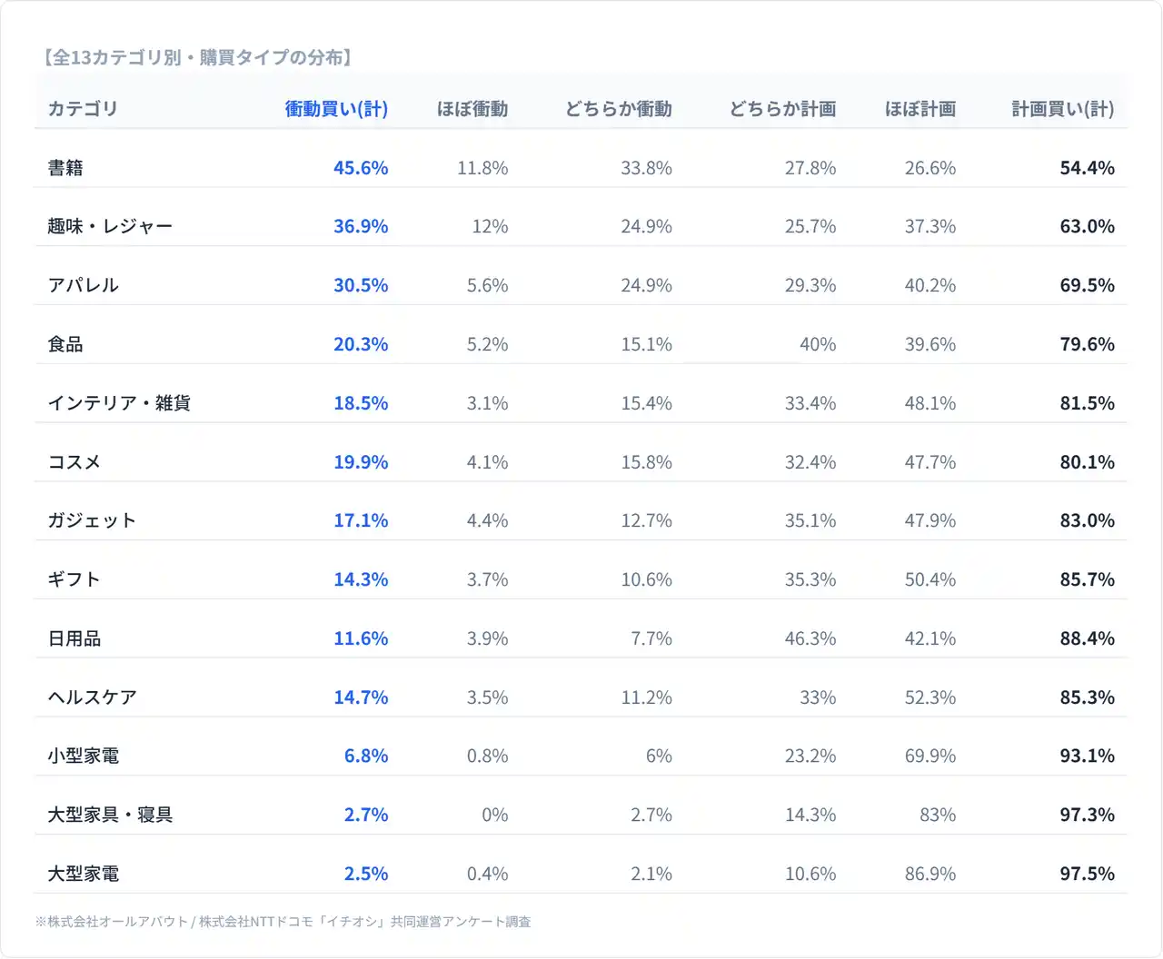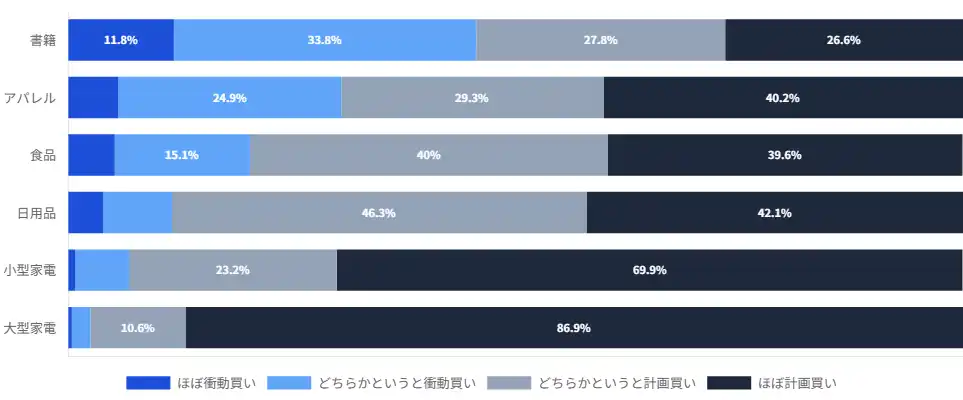 大型家電(97.5%)、大型家具・寝具(97.3%)では計画買いが圧倒的多数。金額の高さや設置スペースの制約といったリスクが、消費者の直感を完全に抑制していることがデータから実証されました。 |