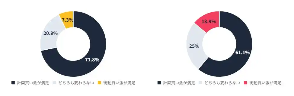 全体の約71.8%が「計画買いは満足度が高い」と回答。しかし、現在の生活幸福度が「非常に高い」層に限ると、衝動買いに満足感を見出す割合が全体の約1.9倍(13.9%)に跳ね上がる結果に。 |