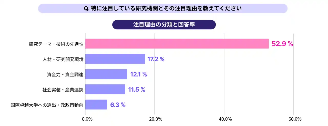 組織への注目理由を集計すると、「研究テーマ・技術の先進性」が52.9%と過半数を占め、最大の評価軸となっています。「人材・研究開発環境」(17.2%)、「資金力・資金調達」(12.1%)が続き、研究者が組織を選ぶ際の主要な評価軸が浮かび上がりました。 |