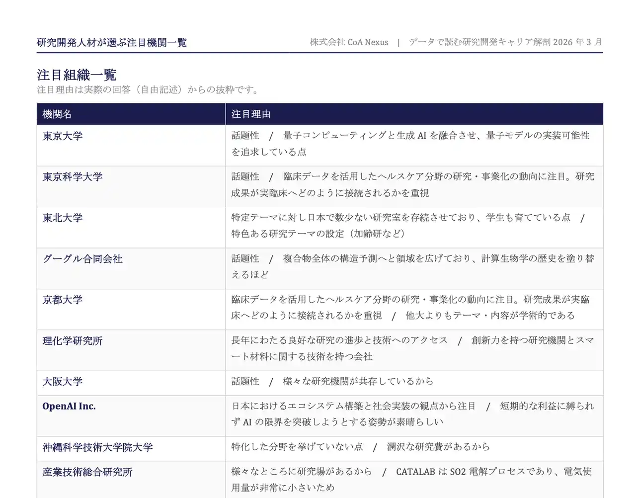 株式会社CoA Nexus(本社:東京都目黒区、代表取締役社長:野崎光太)は、研究開発特化型AIマッチングプラットフォーム「CoA Atlas」を運営しております。このたび、研究開発人材586名を対象とした調査レポート「データで読む研究開発キャリア解剖 2026年3月」の別冊として、研究者自身が選んだ「注目企業・大学・研究機関」を独自に分析・集計し公開いたします。 |