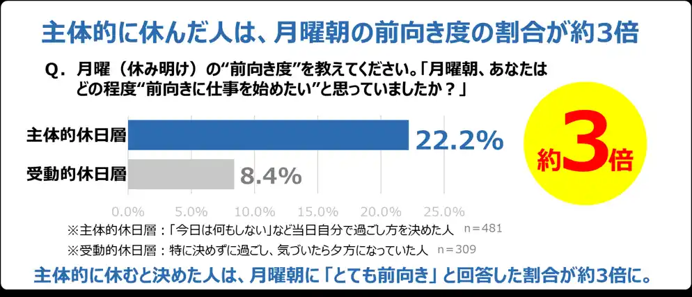 「とても前向き」と回答した人の割合が、主体的休日層22.2%、受動的休日層8.4%で約3倍。