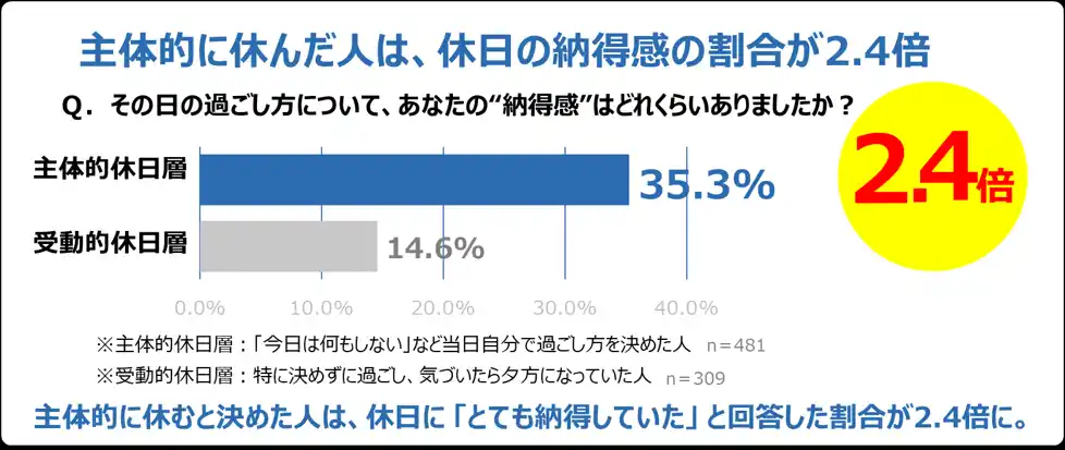「とても納得していた」と答えた方の割合は、主体的休日層35.3%、受動的休日層14.6%で、2.4倍の差。
