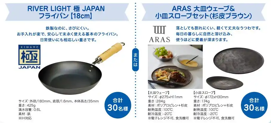 RIVER LIGHT 極 JAPAN フライパン【18cm】 または ARAS 大皿ウェーブ&小皿スロープセット |