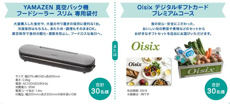 YAMAZEN 真空パック機 フードシーラー スリム 専用袋付 または Oisix デジタルギフトカード プレミアムコース |