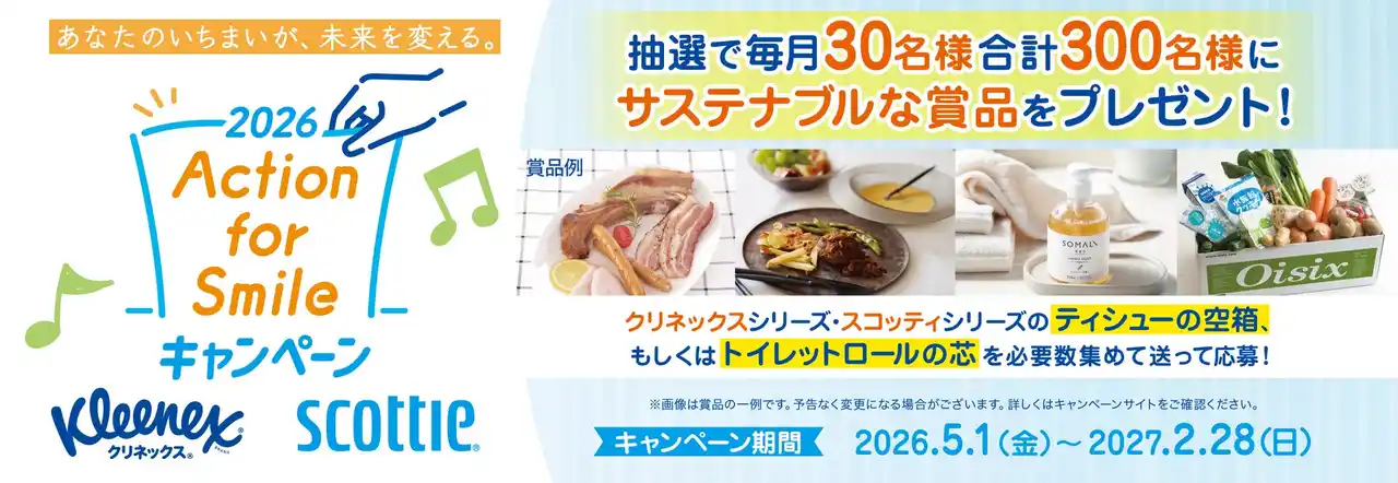 日本製紙グループの日本製紙クレシア株式会社〔住所:東京都千代田区神田駿河台4-6、代表取締役社長:安永敦美〕は、使用後の『クリネックス』や『スコッティ』ブランドのティシューの空箱、もしくはトイレットロールの芯を必要数集めて応募できる「Action for Smile(アクション フォー スマイル)キャンペーン2026」を、2026年5月1日(金)より実施します。 |