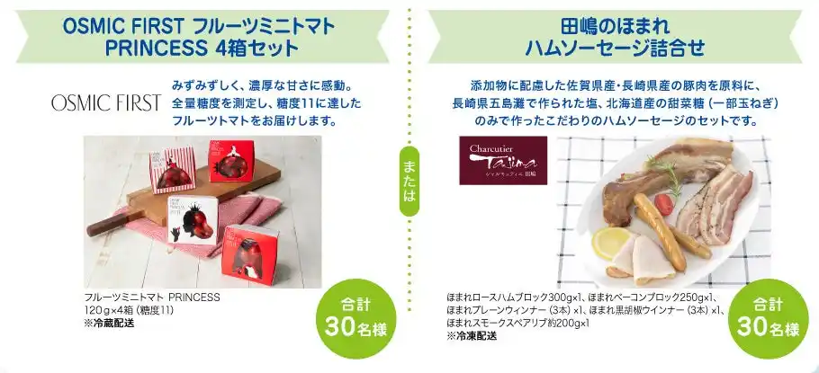 OSMIC FIRST フルーツミニトマト PRINCESS 4箱セット または 田嶋のほまれ ハムソーセージ詰合せ |