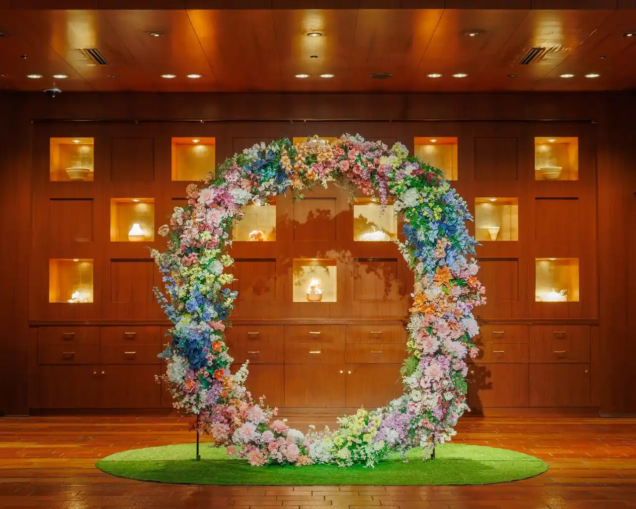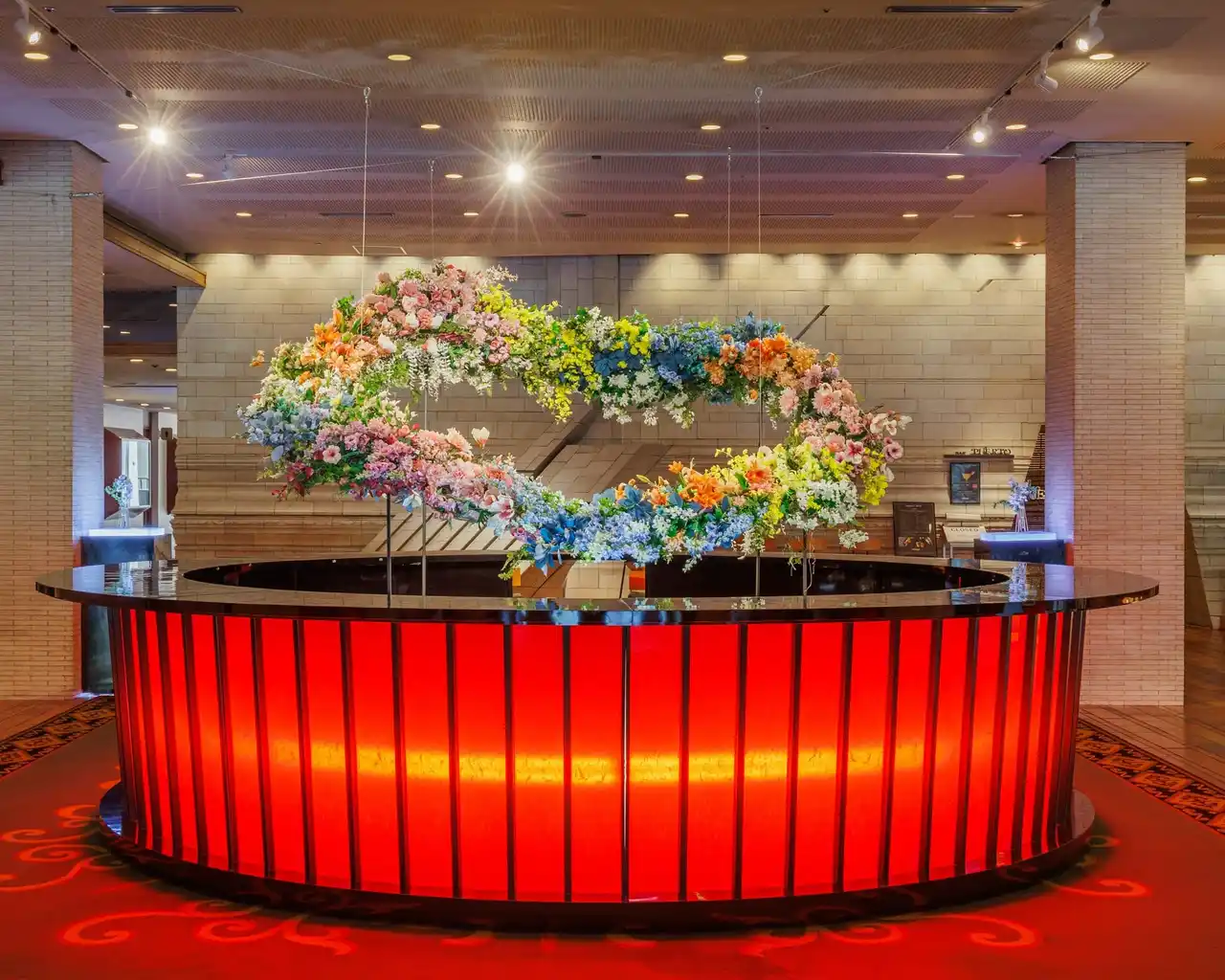 | 名古屋観光ホテルのロビーでは現在、「澄みわたり、満ち、未来へ蒔く」をテーマに、春から初夏へと移ろう繊細な時間の流れが、季節の花々とやわらかな色彩で表現されています。 | ||||||||||||||