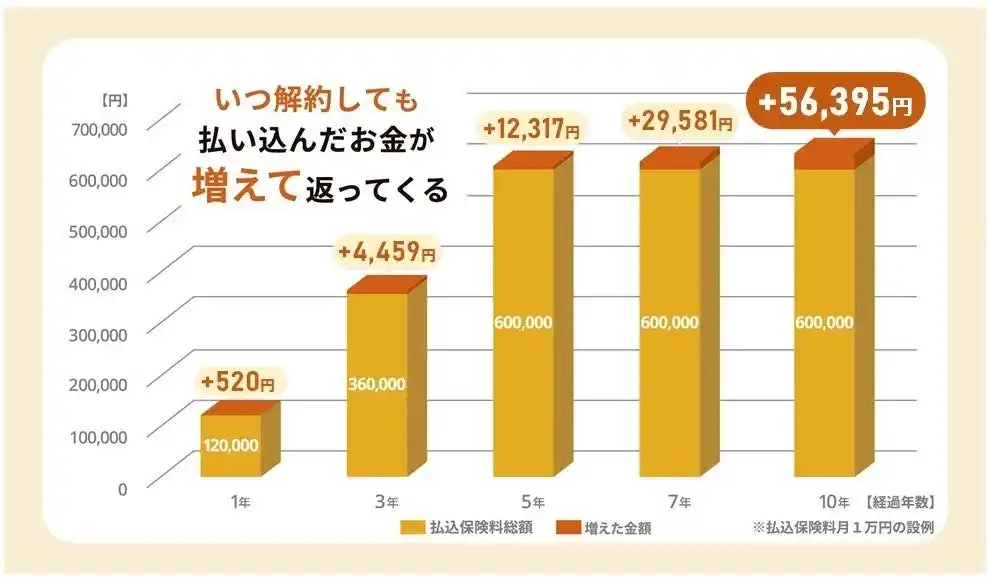 | 「Chakin」は『いつ解約しても払い込んだ保険料が100%以上戻ってくる』『満期まで積み立てればしっかり増える』といった特長がご好評を得ています。 | |||||||||