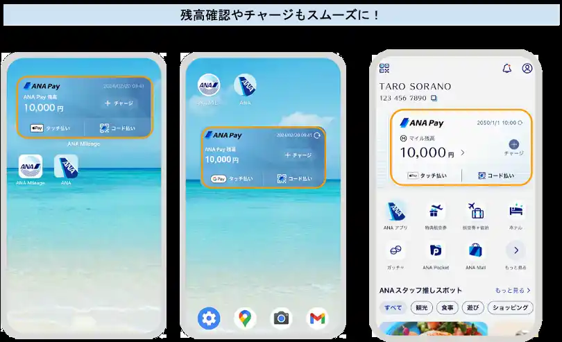 スマートフォン ホーム画面のウィジェットに対応。アプリを開かず、「もっと素早く残高を確認したい」という声に応え、スマートフォンのホーム画面から即座に残高確認やコード表示ができるウィジェット機能を搭載しました。また、ANAマイレージクラブ アプリのホーム画面からもANA Payの残高確認やチャージが直接操作可能になりました。 |