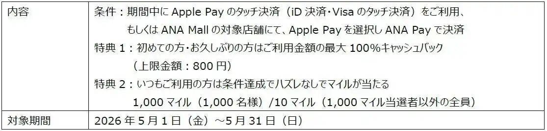 3周年を記念して、5月1日(金)~ 5月31日(日)の期間において、Apple Payをご利用のすべてのお客様を対象とした特別なキャンペーンを実施いたします。 |