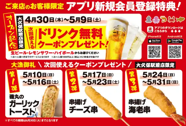 お得に楽しめる公式アプリをリリースしました! 新規会員登録特典でタコさんウィンナー(5個)プレゼントに加え「おつまみさきいか」もプレゼント!更に、ランクアップ特典でドリンク1杯無料クーポンも! |