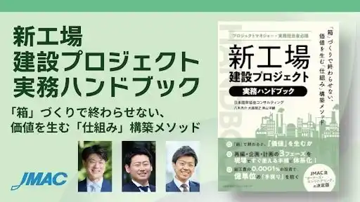 本書は、JMACの八木亮介、大森靖之、神山洋輔の3名による共著で、新工場建設における「オーナーズ・エンジニアリング」の真髄をまとめたハンドブックです。総工費のわずか0.0001%の投資で、将来的な億単位の「手戻り」を防ぐための知見が凝縮されています。 |