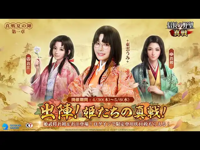 Qookka Gamesが手がける「真戦」シリーズの最新作として、コーエーテクモゲームスの『信長の野望・新生』の公式ライセンスを取得し開発したスマートフォン向けゲーム『信長の野望 真戦』は、ゴールデンウィーク期間にあわせ、ゲーム内外に渡るイベントを多数開催予定です。期間中はログインするだけで限定登用状10枚を入手可能。さらに、新たな姫武将の登場をはじめ、東雲うみさんによる特別企画、VTuber30名が参加する対抗戦、さらに豪華報酬が獲得できるゲーム内イベントなど、多彩なコンテンツが続々と展開されます。 |