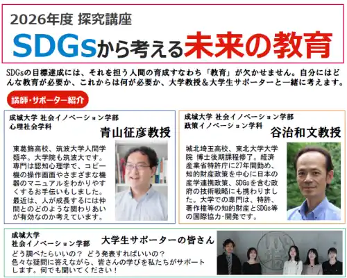 この講座では、SDGsの目標を手がかりに、教育の未来を探究します。世界や日本の新しい学びの取り組みを調査しつつ、「自分は何を学び、どんな未来を作りたいのか」という問いを、仲間と一緒に深めます。成城大学の教授2名と大学生サポーターにより、オンライン上で少人数のグループに分かれてディスカッションを行う「ゼミ形式」の授業を通して、「大学の学び」を体感します。城南コベッツと城南推薦塾の在籍生を対象とした、高校生のためのオリジナル講座です。