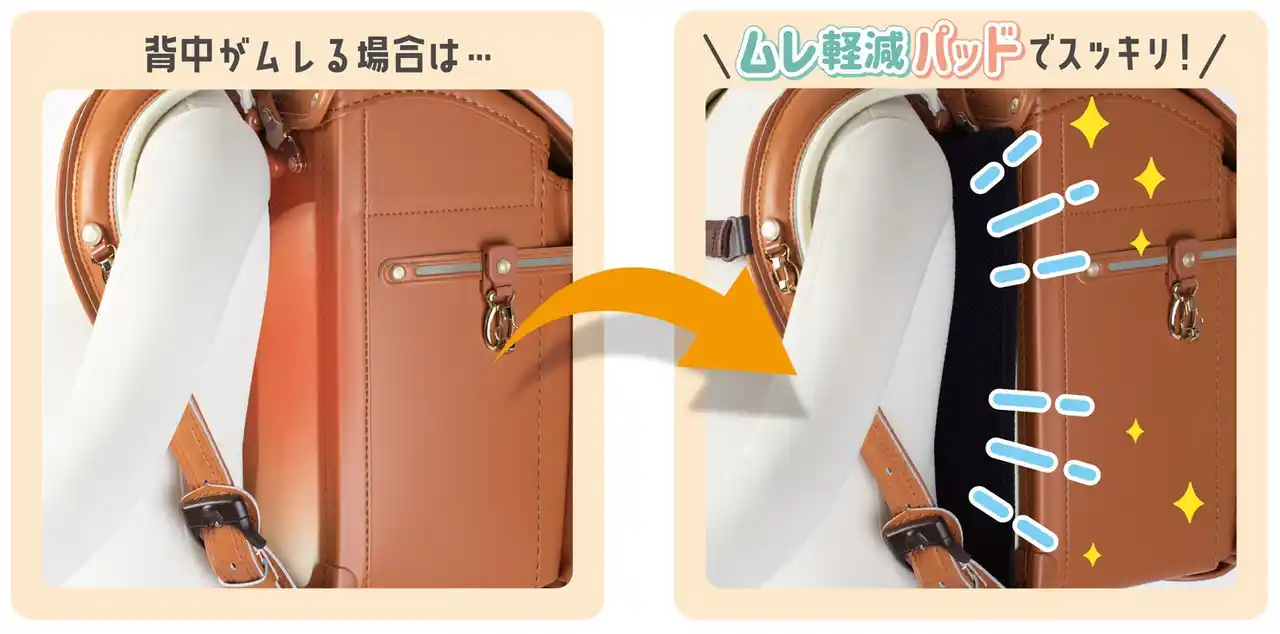 | 特にランドセルと背中の間にこもる熱や汗は、お子さまの不快感だけでなく、熱中症のリスクや肌トラブルの原因にもなりかねません。 | |||||||||